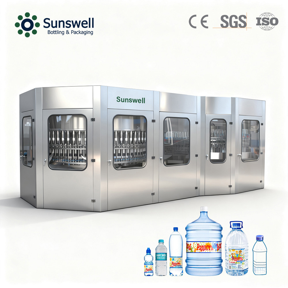 Mesin pembuat air botol monoblock 3 in 1 dapat diterapkan pada produksi air mineral, air murni, air rasa, dan minuman beralkohol rendah, dll. Mesin pengisi air dapat digunakan untuk jalur pengisian air yang berbeda.